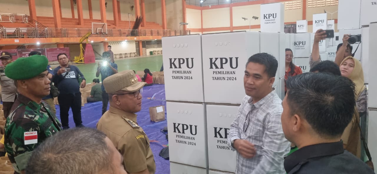 FAKTA GRUP – Penjabat (PJ) Bupati Sanggau meninjau logistik Pilkada serentak tahun 2024 bertempat di GOR Bujang Malaka, Selasa 5 November 2024.